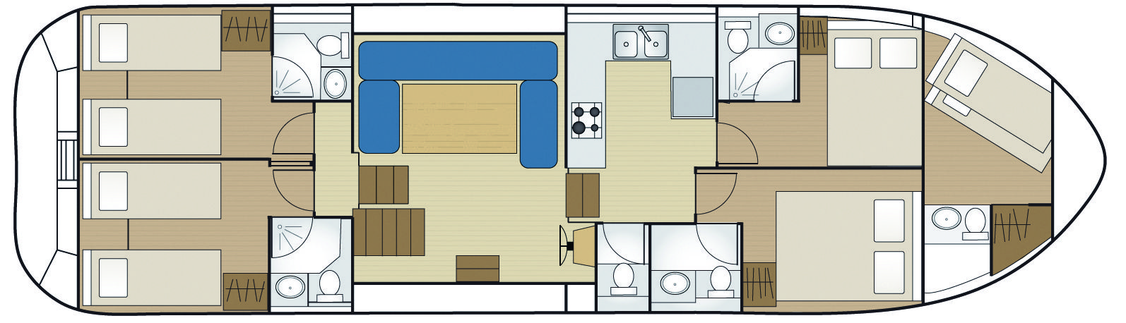 - 2 Kabinen vorne, je mit Doppelbett; 2 Kabinen hinten, je mit 2 Einzelbetten, umwandelbar in ein Doppelbett; kleine Bugkabine mit 2 Liegeplätzen, einem Lavabo und WC (Zugang von aussen, für Jugendliche geeignet).