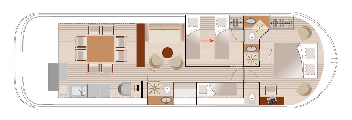 - Grosse Kabine vorne mit Doppelbett, Seitenkabine mit 2 Einzelbetten, umwandelbar in 1 Doppelbett. Mitte extra Klappbett und Ablage.