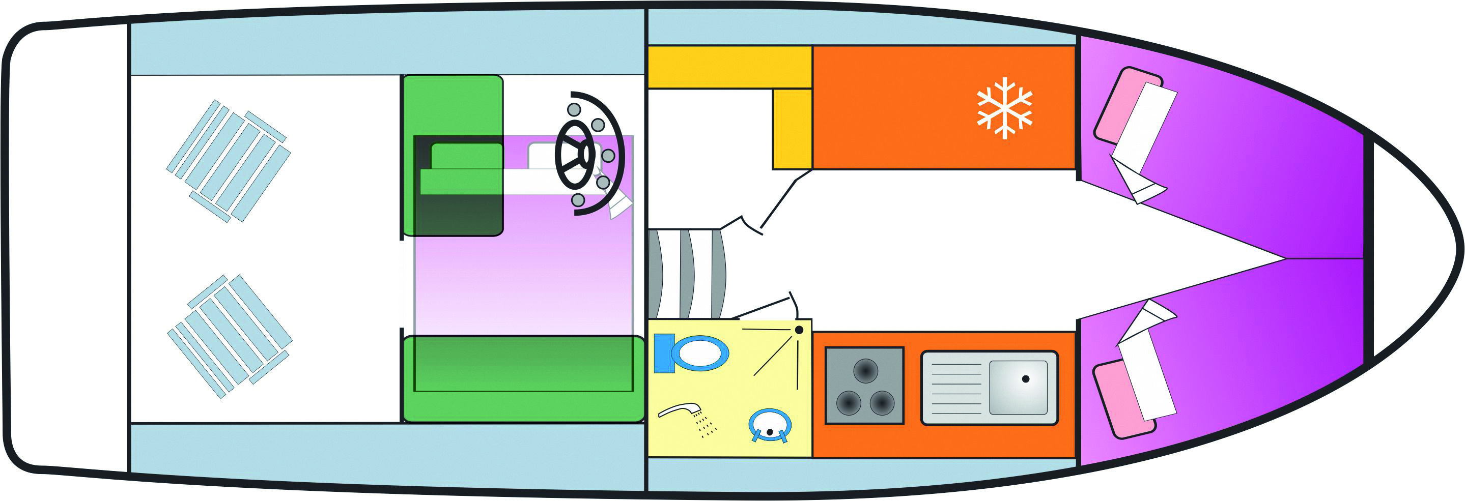 - Vorne, Esszimmer umwandelbar in ein Doppelbett oder 2 Einzelbetten; Kabine hinten mit Doppelbett.