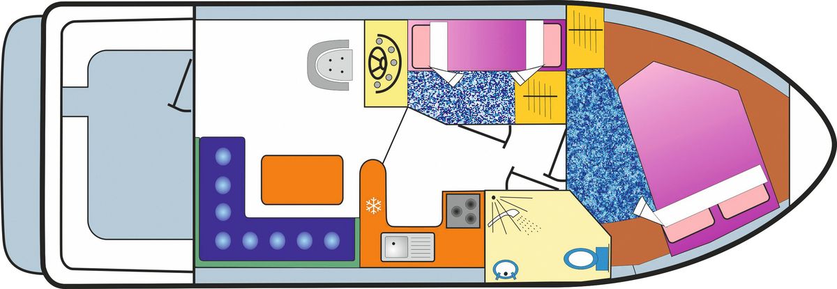 - Kabine vorne mit Doppelbett, Seitenkabine mit 2 Etagenbetten.