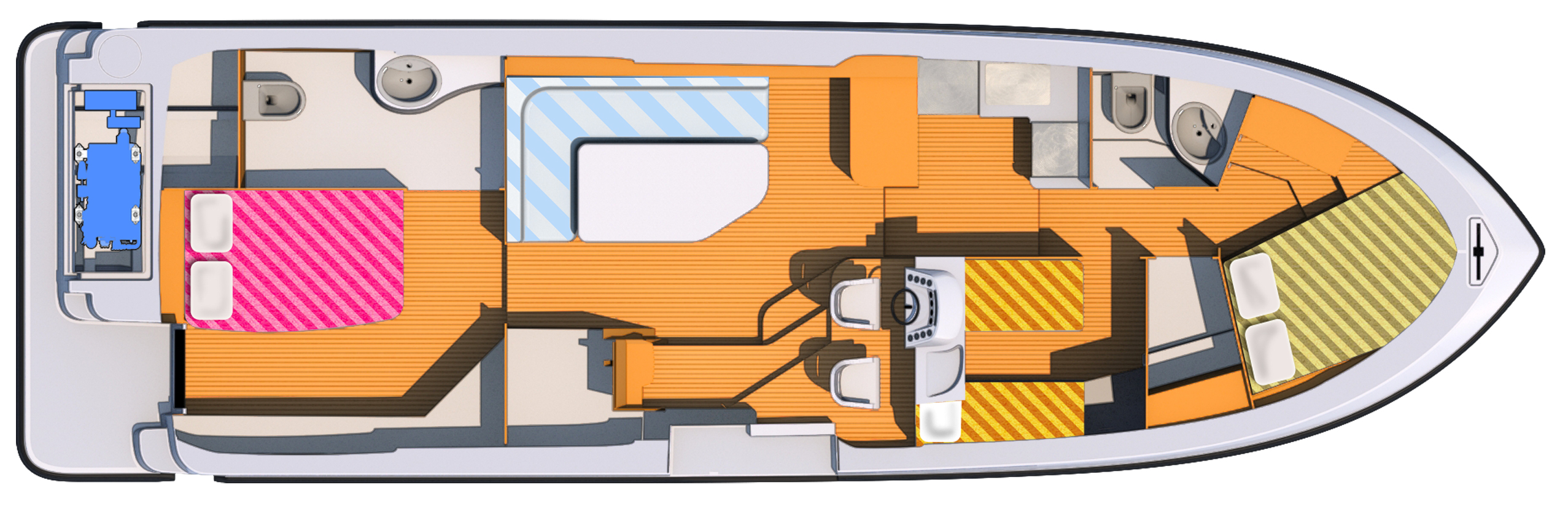 - Kabine vorne mit Doppelbett; Seitenkabine und Kabine hinten mit 2 Einzelbetten, umwandelbar in ein Doppelbett.