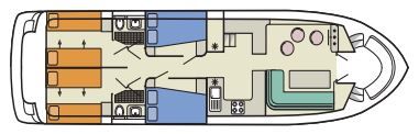- 2 Kabinen hinten, je mit 2 Einzelbetten, umwandelbar in ein Doppelbett; 2 Kabinen Mitte, je mit Doppelbett.