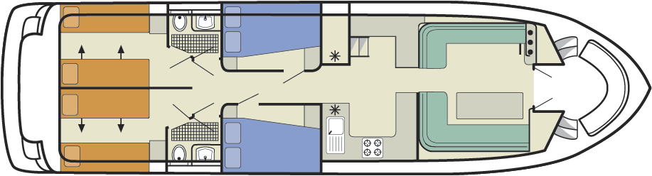 - 2 Kabinen hinten, je mit 2 Einzelbetten, umwandelbar in ein Doppelbett; 2 Kabinen Mitte, je mit Doppelbett.