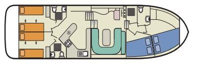 - 2 Kabinen vorne mit Doppelbett; 2 Kabinen hinten, je mit 2 Einzelbetten, umwandelbar in ein Doppelbett.