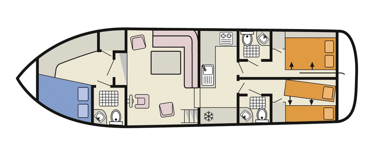 • Kabine vorne mit Doppelbett; 2 Kabinen hinten, je mit 2 Einzelbetten, umwandelbar in ein Doppelbett.