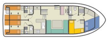 - Kabine vorne mit Doppelbett, Seitenkabine mit 2 Etagenbetten; 2 Kabinen hinten, je mit 2 Einzelbetten, umwandelbar in ein Doppelbett.