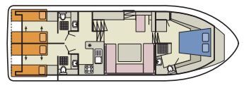 - Kabine vorne mit Doppelbett; 2 Kabinen hinten, je mit 2 Einzelbetten, umwandelbar in ein Doppelbett.