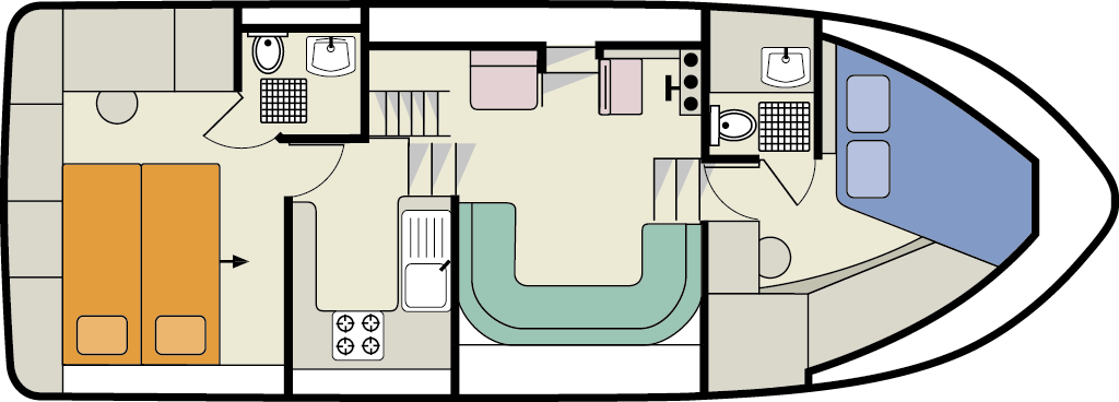 - Kabine vorne mit Doppelbett, Kabine hinten mit 2 Einzelbetten, umwandelbar in ein Doppelbett.