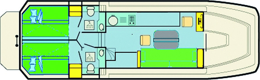 - 2 Kabinen hinten, je mit Doppelbett und einem Etagenbett.