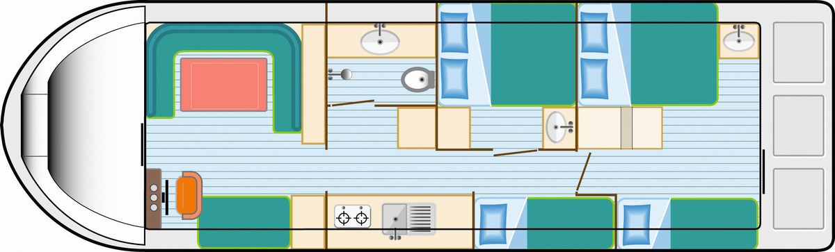 - Kabine Mitte mit Doppelbett, Seitenkabine mit Einzelbett, grosse Kabine hinten mit Doppel- und Einzelbett.