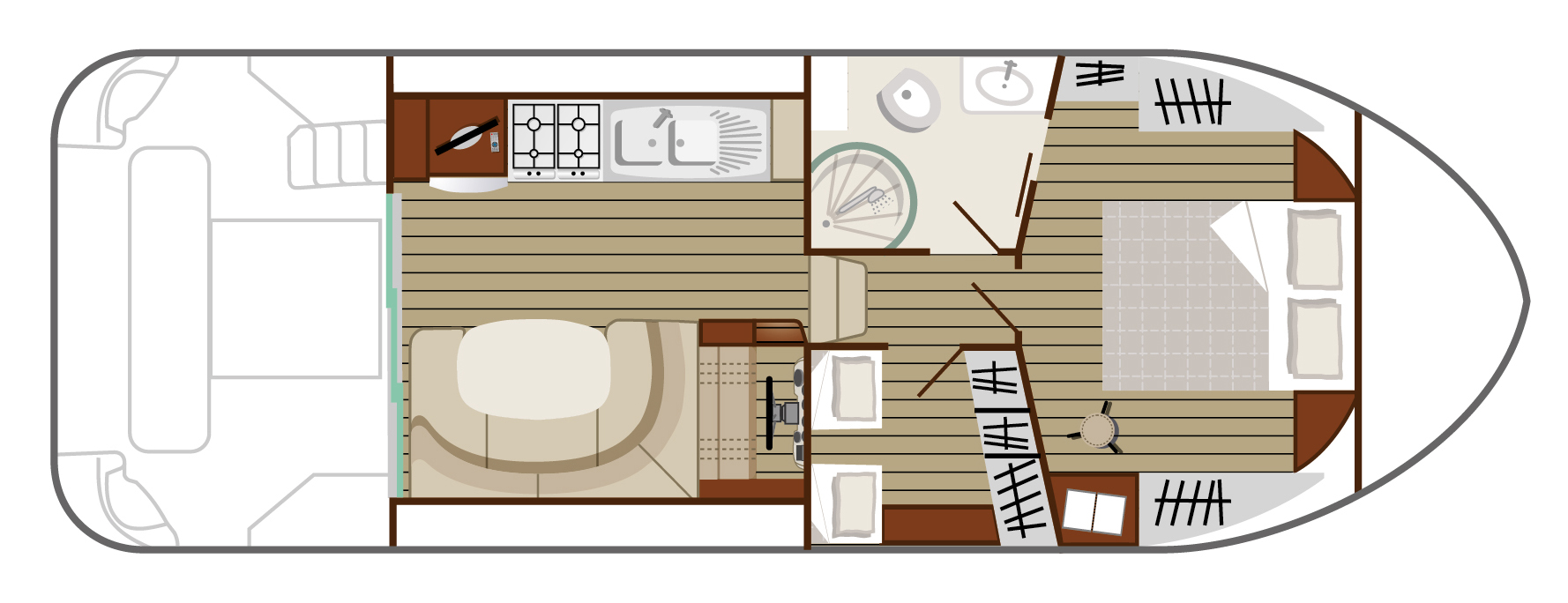- Kabine vorne mit Doppelbett und Kabine mit 2 Einzelbetten, umwandelbar in ein Doppelbett.