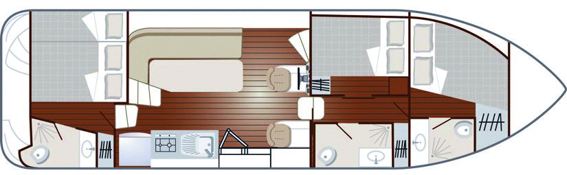 Eine klassische, praktische Konzeption: die Kabinen befinden sich hinten und vorne und sind durch den Aufenthaltsraum getrennt, was ein Maximum an Privatsphäre garantiert. Ein gesicherter Zugang durch einen im Rumpf geformten Gang auf die vordere Terrasse, sowie auf das Achterdeck vom Aufenthaltsraum aus.