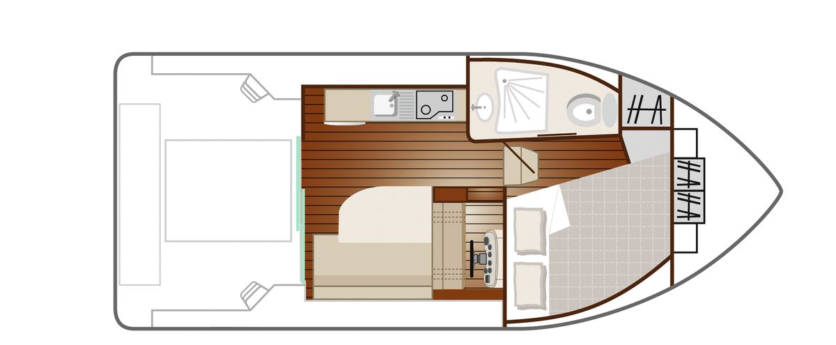 Für Sie reimt Bootsmiete mit Familie, Sippe, Wohnfläche und Vergnügen im Freien. Das Programm «Sedan» bietet genau das, was Sie brauchen! Obwohl diese Boote etwas älter sind, besitzen sie einige wesentliche Vorteile, wie einen wunderschönen Aufenthaltsraum mit Panoramablick und ein direkter Zugang auf die Terrasse. Wegen ihren «Schuhlöffel-Kabinen», die sich teilweise unter dem Salon befinden, sind sie jedoch eher Familien mit Kindern zu empfehlen.