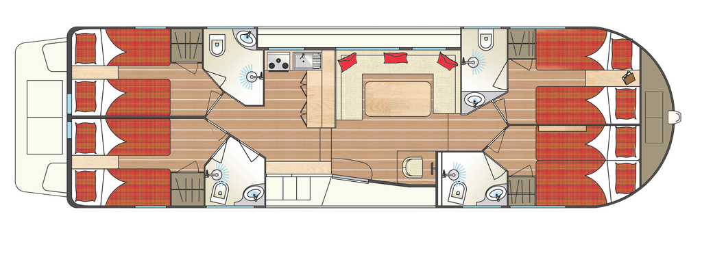 • 2 Kabinen vorne, eine mit 2 Einzelbetten, umwandelbar in ein Doppelbett (auf Anfrage kann ein Etagenbett montiert werden) und eine mit Doppelbett, umwandelbar in ein Einzelbett sowie 2 Kabinen hinten, je mit 2 Einzelbetten, umwandelbar in ein Doppelbett.