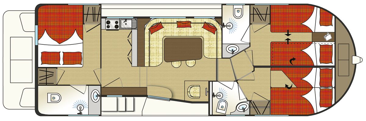 - 2 Kabinen vorne, eine mit 2 Einzelbetten, umwandelbar in ein Doppelbett (ein Etagenbett kann auf Anfrage montiert werden), die andere mit einem Doppelbett, umwandelbar in ein Einzelbett; Kabine hinten mit Doppelbett.