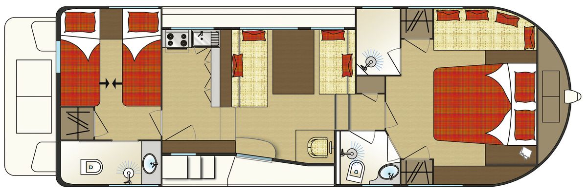 - Geräumige Kabine vorne mit Doppelbett und Kanapee (umwandelbar in ein Einzelbett); Kabine hinten mit 2 Einzelbetten umwandelbar in ein Doppelbett.