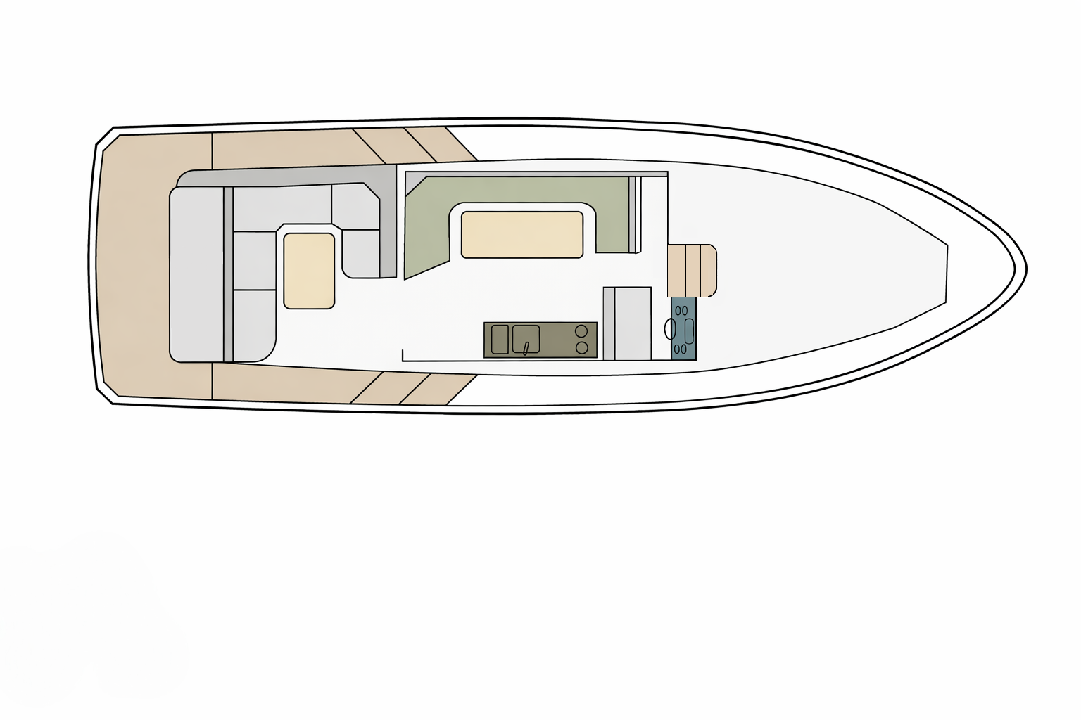 - Elektrisches Schiebedach über dem Steuerstand, ebenerdige Terrasse hinten mit Bimini und Badeleiter, sowie ein Sonnendeck.