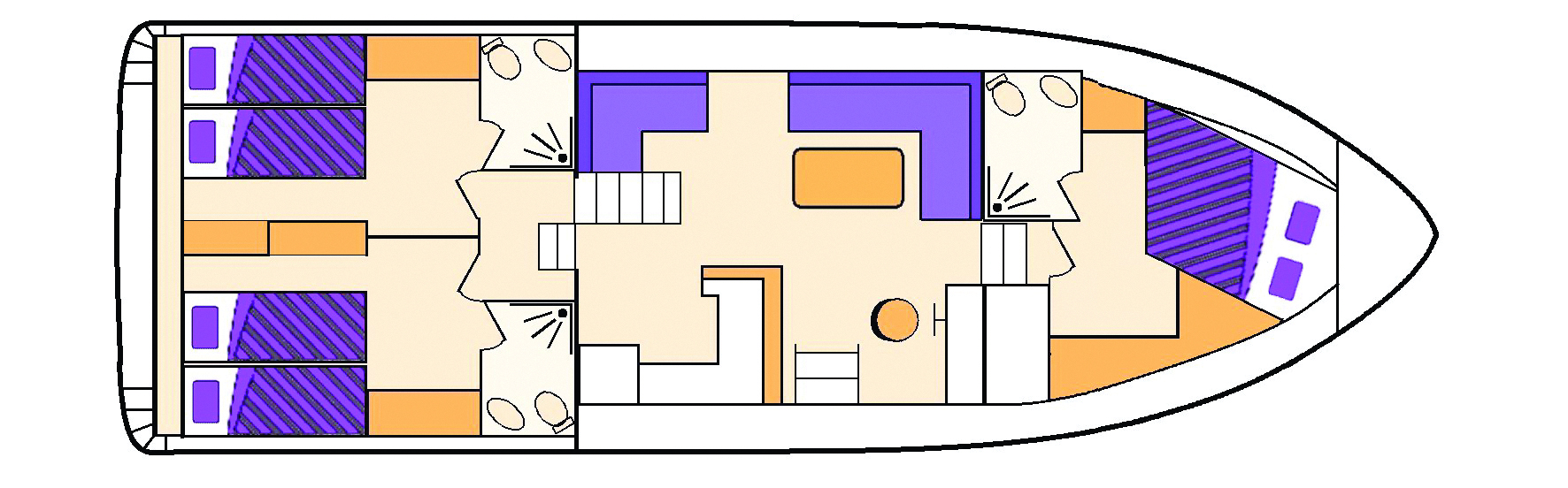 - Kabine vorne mit Doppelbett; 2 Kabinen hinten, je mit 2 Einzelbetten, umwandelbar in ein Doppelbett.
