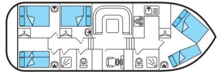 - Kabine vorne mit Doppel- und Einzelbett, Kabine Mitte mit Doppelbett; 2 Kabinen hinten, eine mit Doppelbett, die andere mit 3 Einzelbetten, wovon ein Etagenbett.