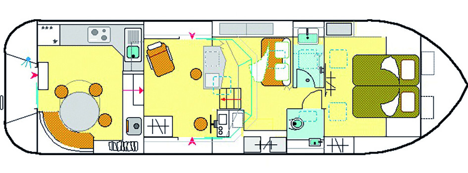 - Mitte, Salon umwandelbar in ein Doppelbett durch einen Vorhang getrennt; Steuerung und Sitzplätze für die Mannschaft. Hinten, Küche und schönes Esszimmer, Kaminofen.